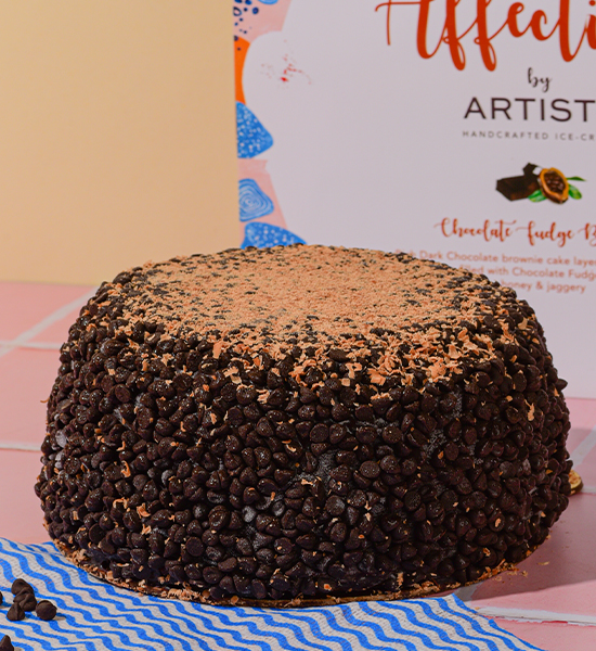 Dark chocolate brownie made with jaggery loaded with rich chocolate ice cream and chocolate fudge sauce in the center finished with a thick layer of chocolate sauce.