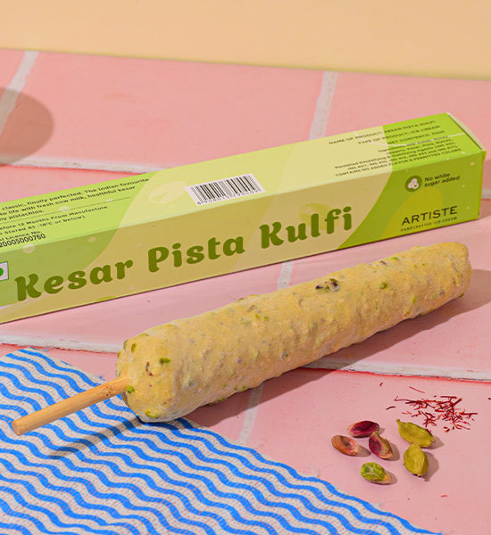 The ‘variant’ of a cult classic in the Artiste universe. Kesar pista kulfi made with rich condensed milk & pistachio sweetened with honey and jaggery.